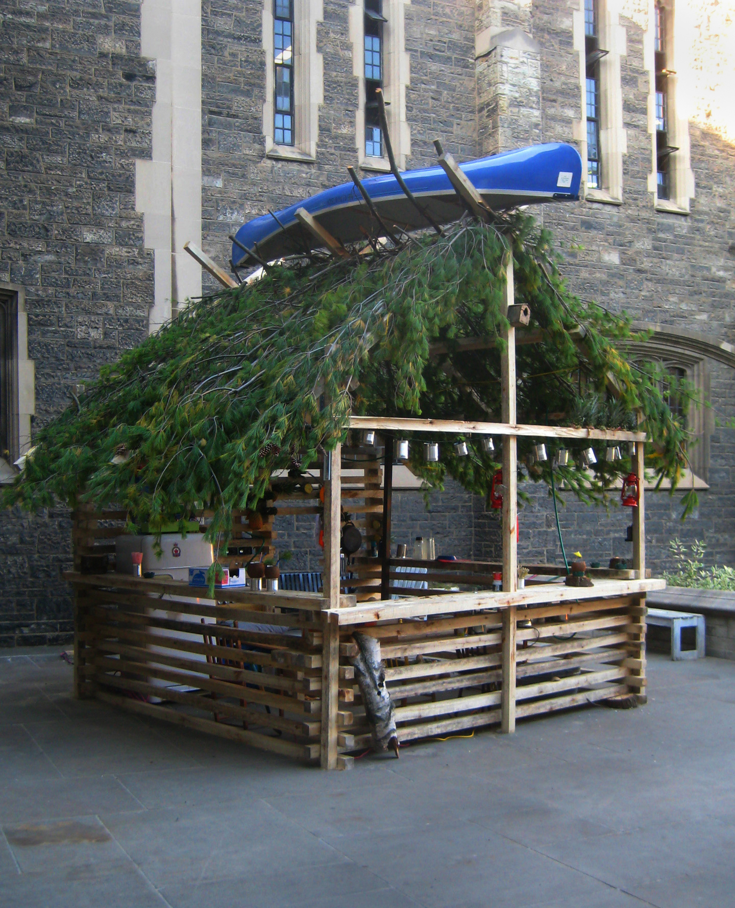 Created (after Géricault) for the sculpture biennale St-Jean-Port-Joli, featuring a heavily overbuilt picnic table fastened by ropes to a large rock on a tidal plain in the St. Laurent river basin. Twice a day, the tide submerges the rocky point and the table, somewhat floating, smashes repeatedly against the rocks. Each time at low tide, the table makes landing, beaching itself somewhere slightly new. Repairs are then made and celebrated by opening up a six seater "restaurant" that focuses on small course simple seafood dishes. Malpeque oysters with lime, grilled sardines with Harissa and olive oil, whole radishes with salt. A selection of chilled white wines are available. Everything is gratis to those make the arduous 17 min trek over rocks and across bog out to the point on the water where the sunsets are spectacular.